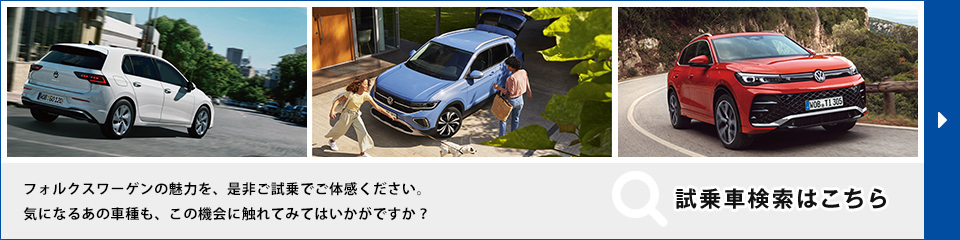 Volkswagen静岡駿東では、フォルクスワーゲン車の魅力をお客様の目でじっくりとご確認・ご体感いただけますよう、全モデルをご覧いただける展示車・試乗車をご用意いたしております。